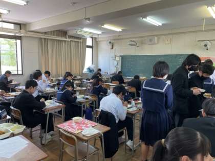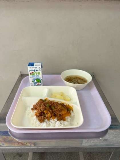 給食では、牛ひき肉、豚ひき肉、玉ねぎをいため、カレー粉、トマトピューレ、ケチャップ、ウスターソースなどで味つけした具をご飯にかけて食べます。