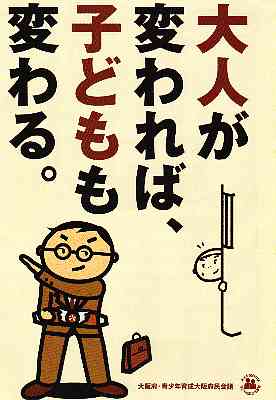 大阪府・青少年育成大阪府民会議では、青少年による凶悪事件の発生やいじめ・不登校の増加など、青少年問題の背景の一つといわれる規範意識に欠ける大人社会の風潮を見直し、大人自身の姿勢や大人社会のあり方を省みる“きっかけ”となるよう、「大人が変われば、子どもも変わる運動」を推進しています。