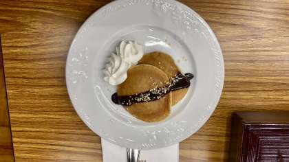 デザートにパンケーキが出てきました!みんなびっくり。味、ボリューム共に充実してました。