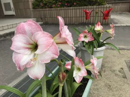 赤やピンク、鮮やかな花弁のアマリリスが、学校図書館前の鉢植えで鑑賞することができます。