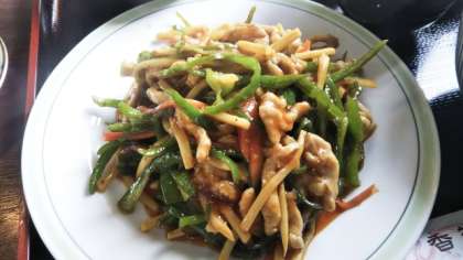 牛肉と細切りにしたピーマンやたけのこなどを炒め、砂糖やしょうゆ、オイスターソースなどで味付けしています。