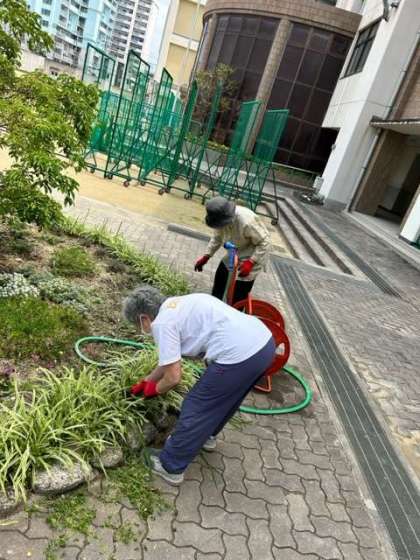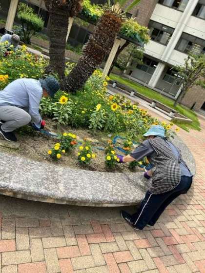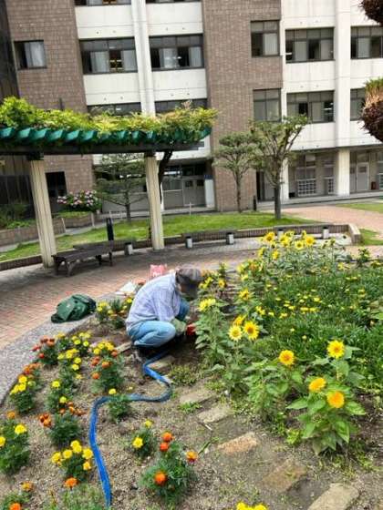 中庭では、本日も学校元気アップ事業のボランティアの方々が、園芸作業に取り組んでおられます。