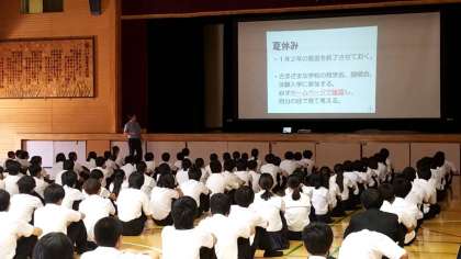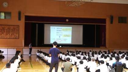 3年生は、体育館にて生徒向けの進路説明会がおこなわれています。