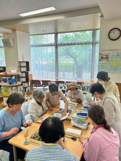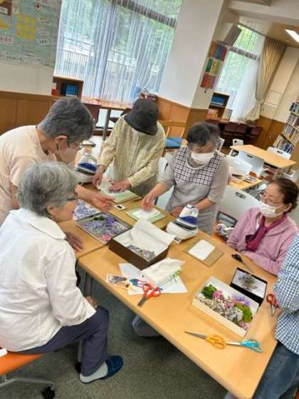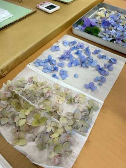 学校元気アップ事業のボランティア活動方々が、旭陽中学校で育てた草花を押し花にして、しおりを制作しています。