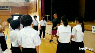 プラスチックの器(お皿のような形)を、木の棒で回して遊びます。