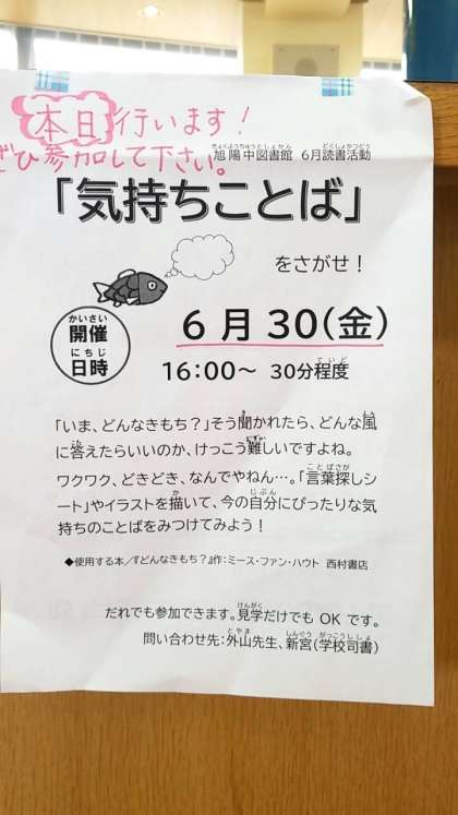 本日の放課後、中学校図書館では、6月の読書活動として「気持ちことば」のイベントが開催されています。