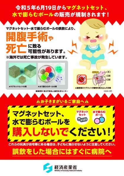 強力な磁力を有する複数個の磁石を組み合わせて使用するいわゆるマグネットセットや、水を吸収することで大きく膨らむ吸水性の玩具は、6月19日より販売できなくなりました。子どもが同製品に触らないように御留意いただくことが重要であります。