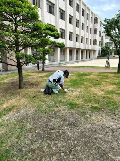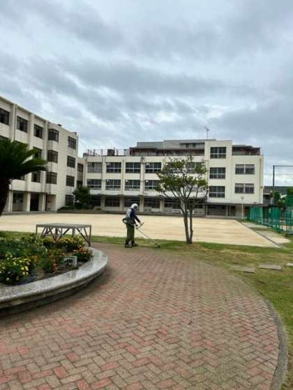 管理作業員さんが、手分けして中庭の芝生の剪定と除草作業をしてくれています。