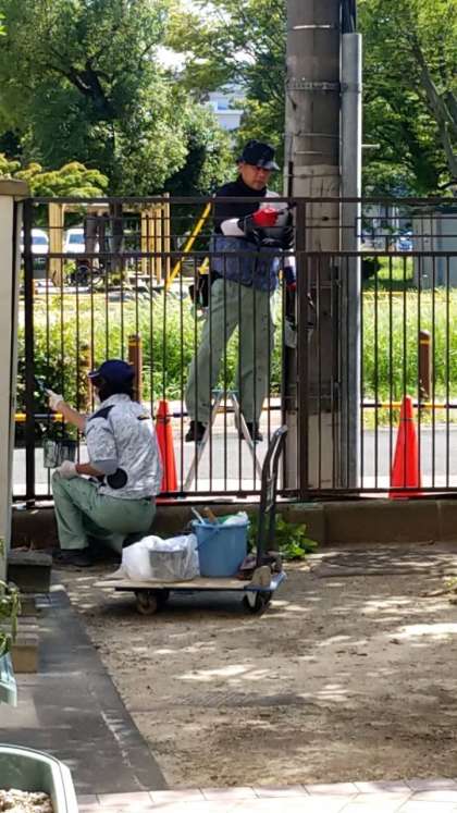 猛暑の中、管理作業員さんが外柵の塗装作業に取り組んでいます。