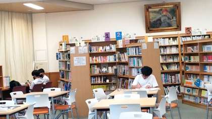 図書館では、図書部の生徒が読書に取り組んでいます。
