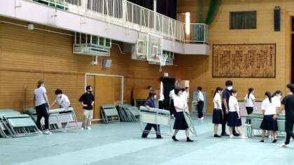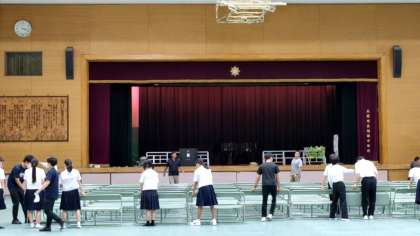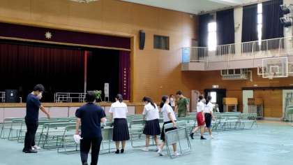 明日の合唱コンクールに向けて、体育館では会場設営がおこなわれています。