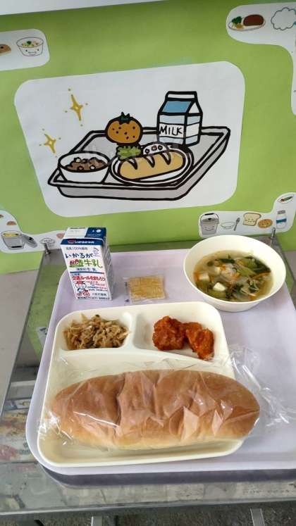 ・今日の給食は、油で揚げた鶏肉に、料理酒、みりん、濃い口醤油、ケチャップ、コチジャンで作ったたれをからめています。
