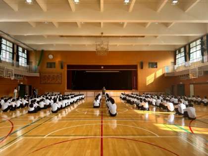 今朝、4組の委員長が司会を務め、1年生が定例の学年集会を体育館にておこないました。