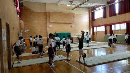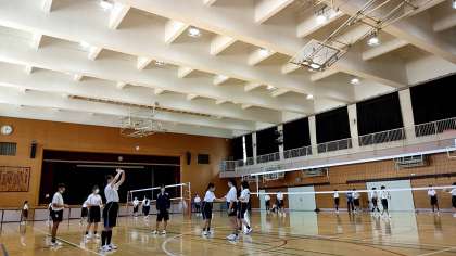 保健体育科では、体育館と格技室にわかれて、バレーボールとマット運動の授業がおこなわれています。