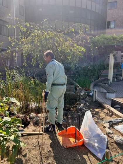 管理作業員さんが、中庭にある池をきれいにしてくれています。