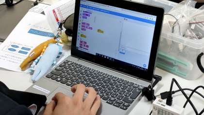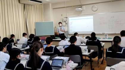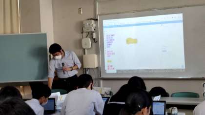 本日も、大阪工業大学工学部の田熊隆史様をお招きし、3年生に対して、「studuino:bit を使ったロボット制御」の特別授業をしていただいてます。