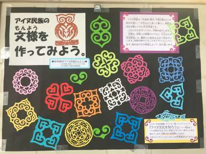 11月の掲示物は『文様を作ってみよう』です。アイヌ民族の文様型紙の本から、図書部員が好きな形を選んで、切り絵を作りました。