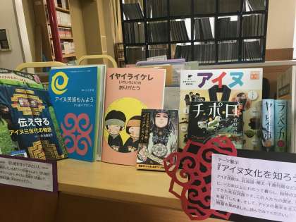 学校図書館入り口には、アイヌ民族の歴史、文化、言葉を紹介した本や、アイヌの若者が主人公の物語などを集めたコーナーを作っています。
