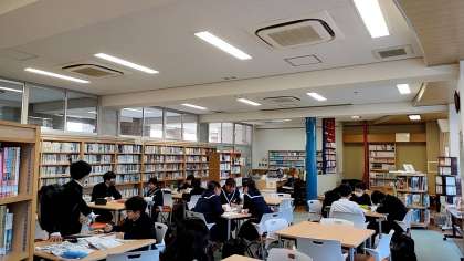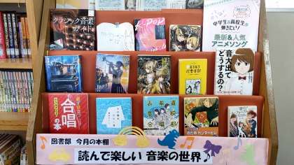 図書部でアイデアを出して作っている今月の本棚、今回は『読んで楽しい音楽の世界』です。音楽や合唱をテーマにした物語や合唱の本、簡単に弾けるピアノスコア(楽譜)などを紹介しています。