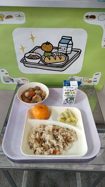 ・今日の給食には、鶏肉、うずら卵、ごぼう平天、じゃがいも、こんにゃく、厚揚げ、大根、人参が入っています。