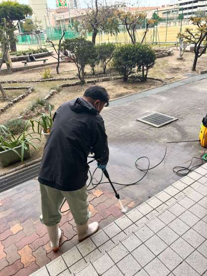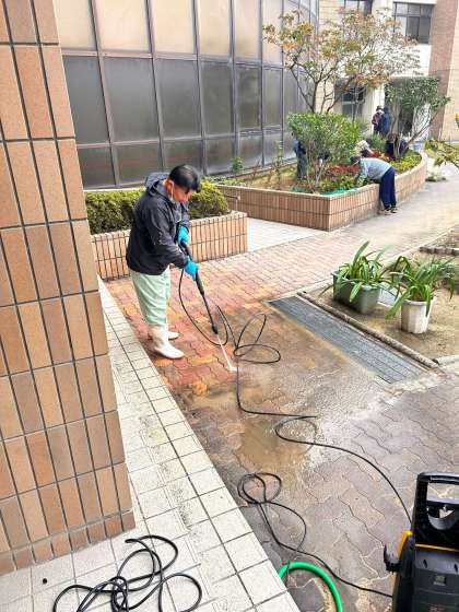 管理作業員さんが、高圧洗浄機を使って中庭の歩道を清掃していただいています。