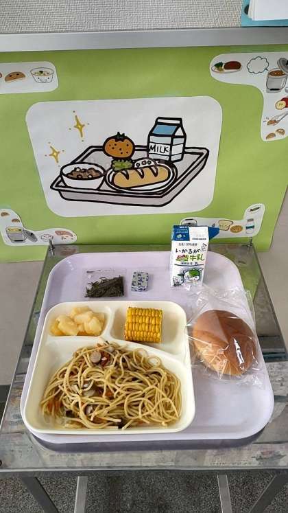・今日の「ウインナーときのこの和風スパゲッティ」には、しいたけとしめじが使われています。