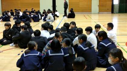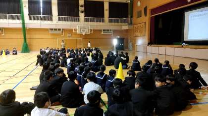 体育館では、1年生が人権教育をおこなっています。