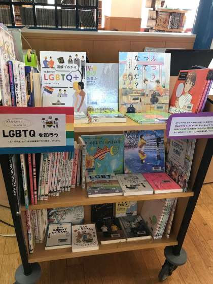 それに向けて、中高生がLGBTQについて理解しやすい本を、学校図書館入り口のブックトラックで展示しています。