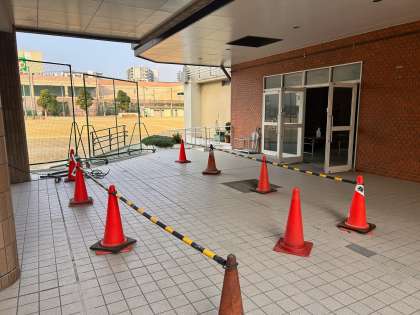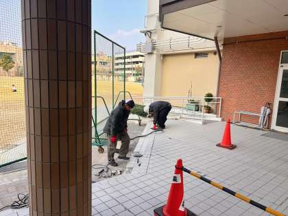 体育館前の床が劣化に伴いかなり傷んでいます。