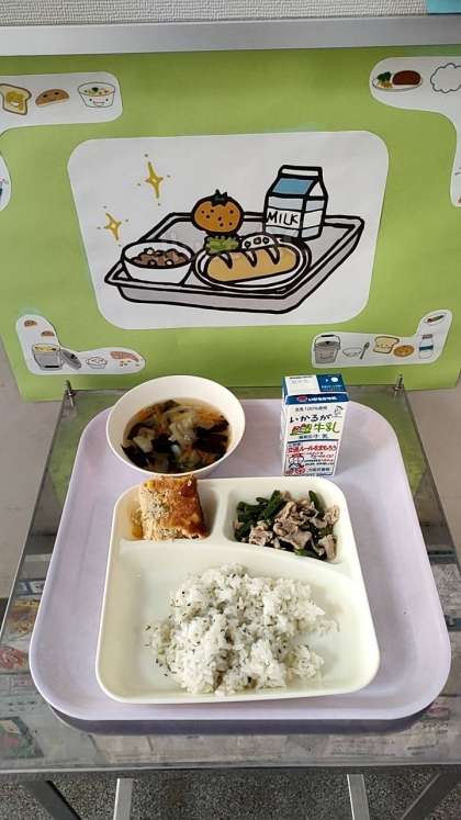 ・今日の給食の千草焼きは、卵の中に鶏肉、豆腐、コーン、みつばが入っています。