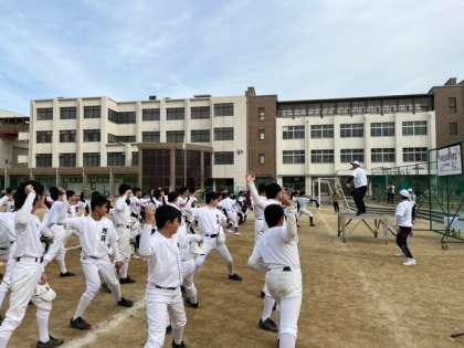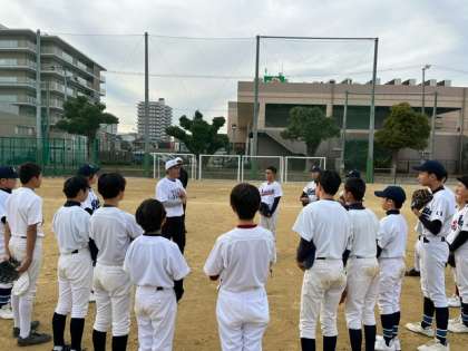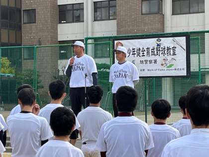 9日の午後より旭陽中学校で、旭警察主催の青少年健全育成野球教室が開かれました。特別コーチとして、元阪神タイガースの藪 恵壹選手、上坂 太一郎選手らが旭区の中学校野球部の子どもたちに投げ方の基礎や守備、走り方などを指導してくださいました。子どもたちも熱心に指導を聞き、技術向上と野球への思いを大きくしたようでした。