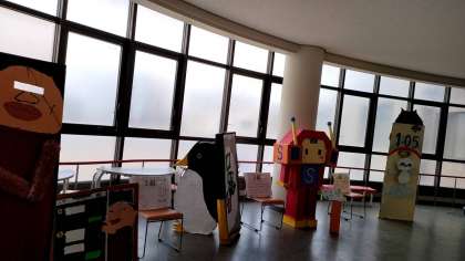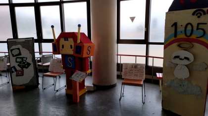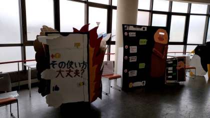 4階円形ホールでは、1年生の懇談会の間、文化祭で展示していたスマートフォンの作品が再展示されていました。
