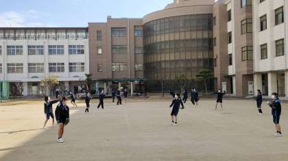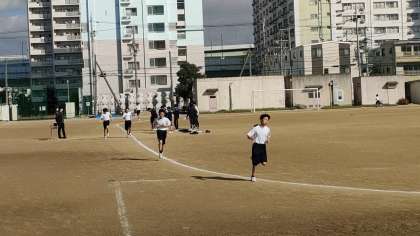 グランドでは持久走、中庭ではソフトボールがおこなわれています。
