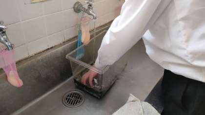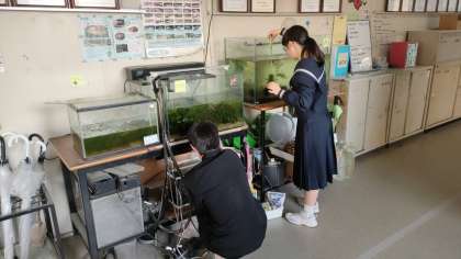 自然科学部が、職員室前の水槽の清掃活動をおこなっています。