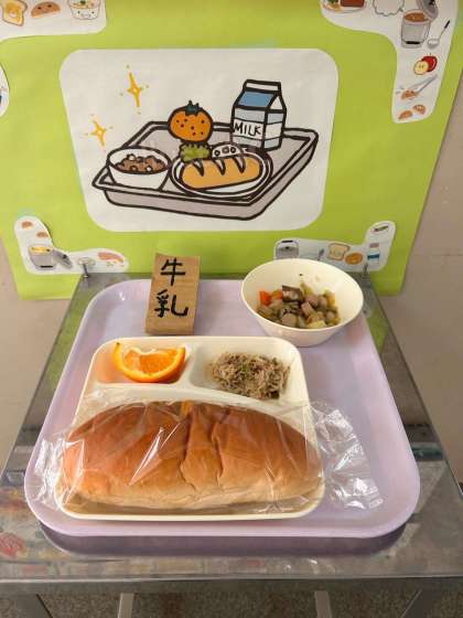 ・給食では、牛肉やウインナー、ジャガイモ、キャベツ、人参、パセリを使って作っています。