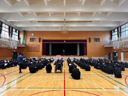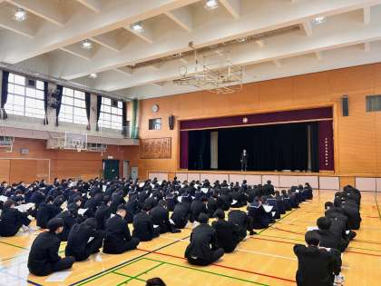 今週末にある私学入試に向けて、事前指導が体育館でおこなわれています。