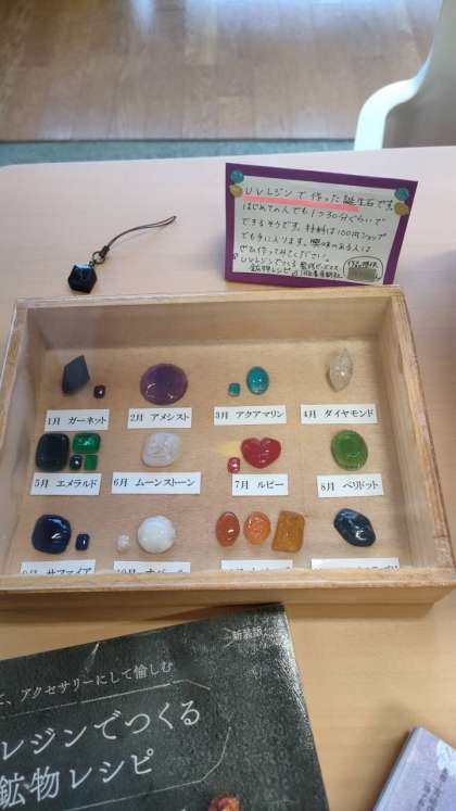 学校図書館をよく利用する生徒が、UVレジンを加工して誕生石(鉱物レジン)を作ってきてくれました。