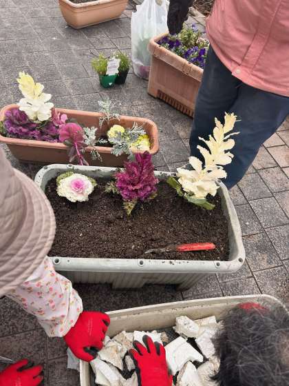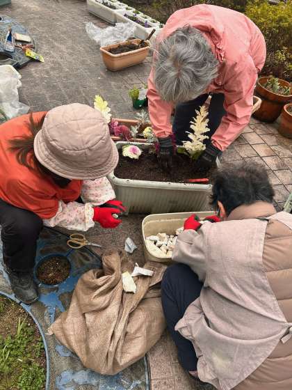 卒業証書授与式のために、ボランティアの方々が寄せ植えをしてくださっています。