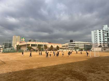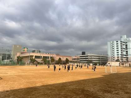 曇り空が広がっていますが、男子生徒が元気にサッカーの授業をおこなっています。