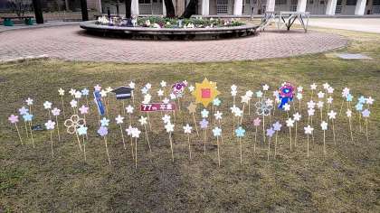 中庭にも、3年生の卒業を祝うモニュメントが飾られています。