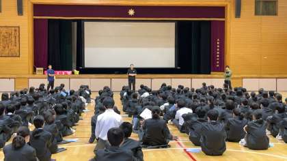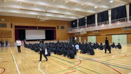 体育館では、1年生がキャリアパスポートを配布し、学校の決まりごとの説明、教職員の自己紹介等をおこなっています。