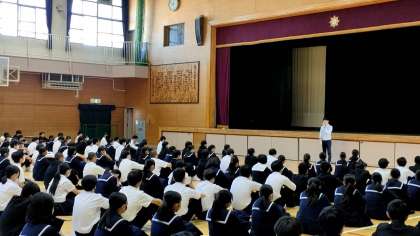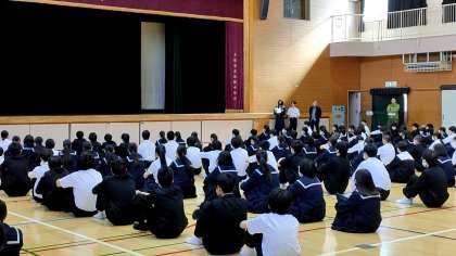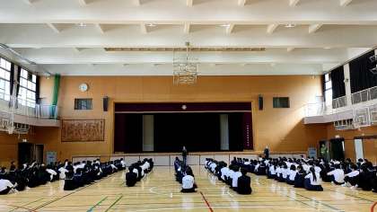 体育館では、3年生が学年集会をひらいています。
