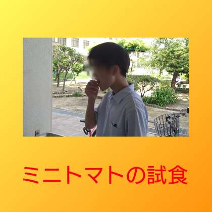 収穫したミニトマトを試食しました。「おいし〜い」「甘いね」と笑顔いっぱいの部員たち♪