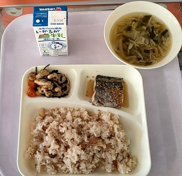 今日の給食のすまし汁と大豆の煮ものには、さばぶしとにぼしの混合けずりぶしと、こんぶでとっただしを使用しています。