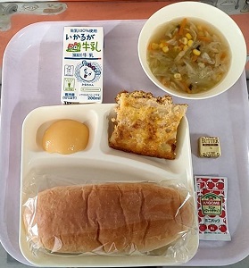 オムレツは、卵に塩、こしょうで味をつけ、手早くかき混ぜて焼いた料理です。給食のオムレツは、卵、ツナ、じゃがいもを容器に入れて、焼き物機で蒸し焼きにしています。