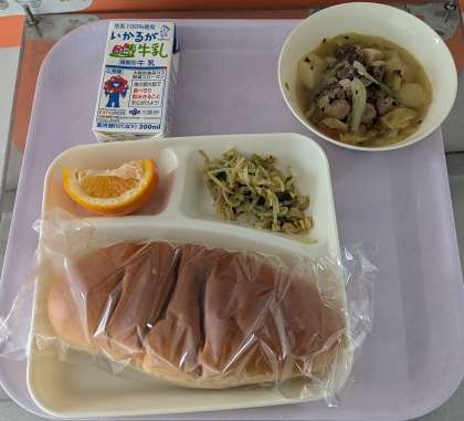 給食では、牛肉やウインナー、じゃがいも、キャベツ、にんじん、パセリを使って作っています。