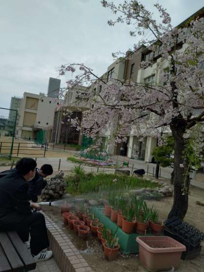 花菖蒲やホウレンソウ、アスターなどに水やりをしながら、お花見をしています!!