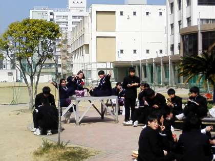3年生のあるクラスでは、昼食を中庭の芝生で