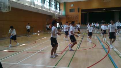 男子は体育館でドッジボール、女子はグラウンドでサッカーを行いました。