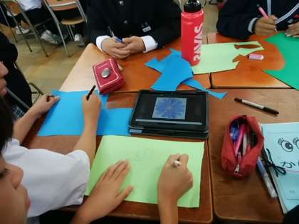 色画用紙を、ダンボールの型に合わせて切って貼りつけます
